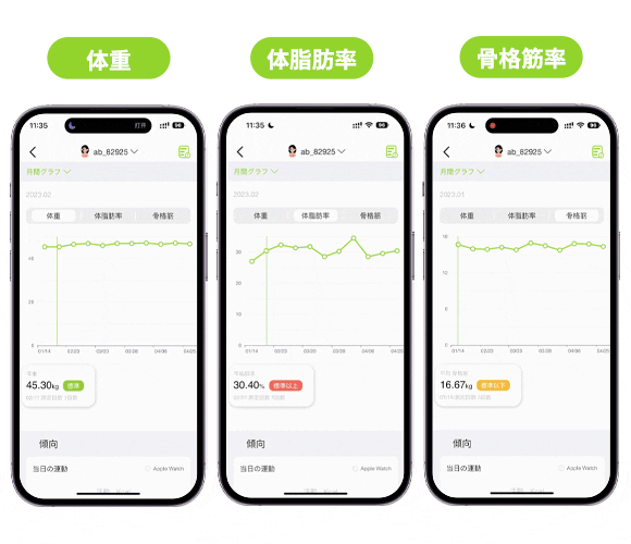 体重と体脂肪率、骨格筋率の3種類のデータは、数値だけでなくグラフでも表示されます。変化が一目で分かりますので、ダイエットのやる気もアップします。
