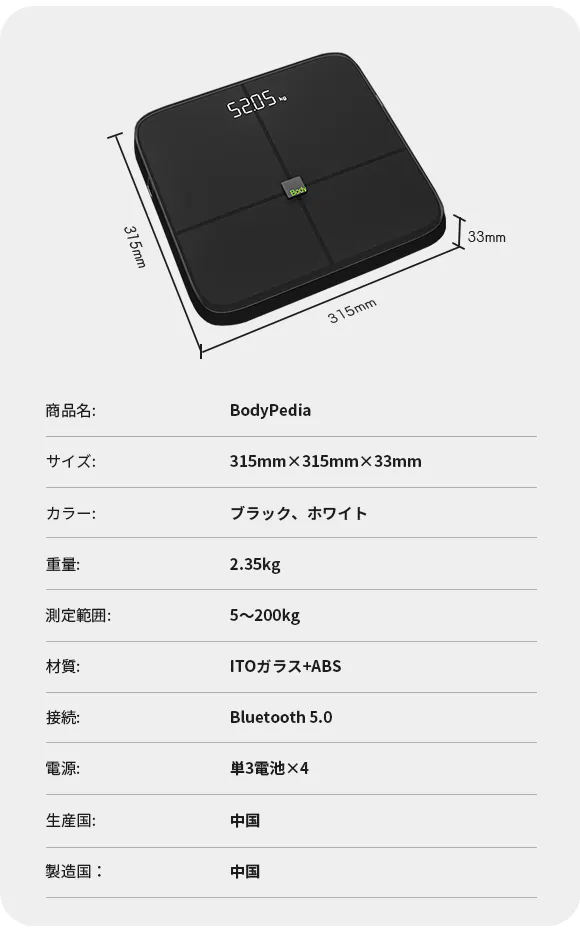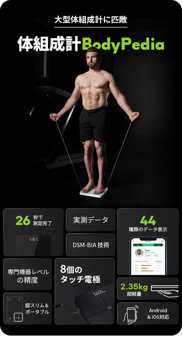 体組成計は体の状況を正確に測定し、データ化することで、あなたのダイエットやトレーニングの目標達成をお手伝いします。ぜひ毎日の生活にBodyPediaを取り入れてみてはいかがでしょうか?