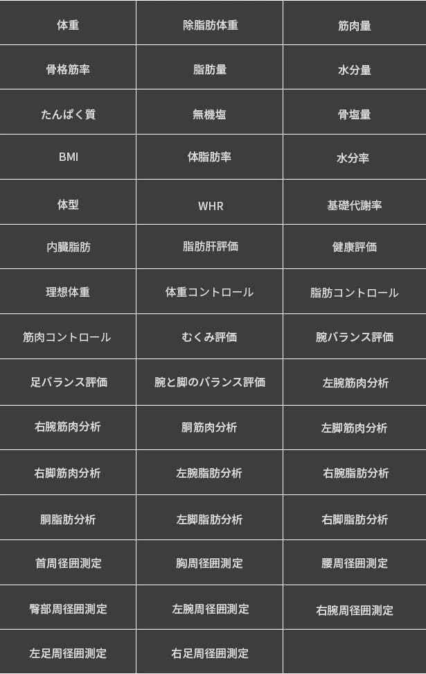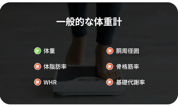 DSM-BIA技術採用の体組成計には低周波で測定した下半身のデータから、全身のデータを推測する製品もあります。また、一般的な家庭用体重計は、入力した体重と身長からデータを推計するだけです。BodyPediaはこのような推測によるデータは一切ありません。