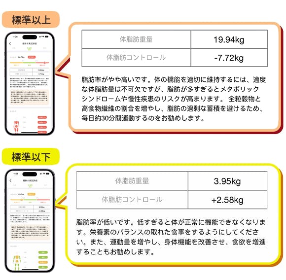 これをもとに、健康に関するアドバイスやデータベースにある理想体型データとの比較などの情報を提供し、目標を明確にするお手伝いをします。