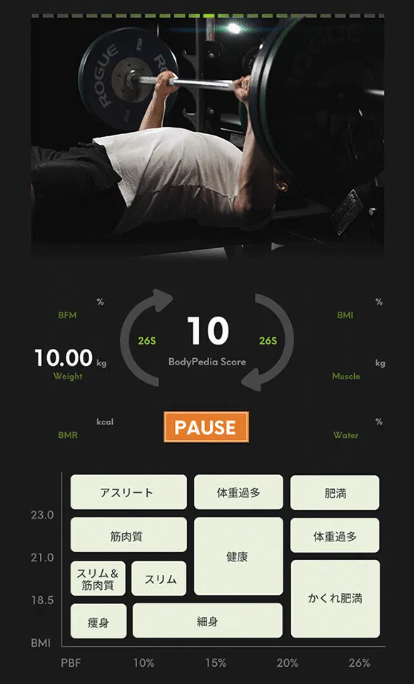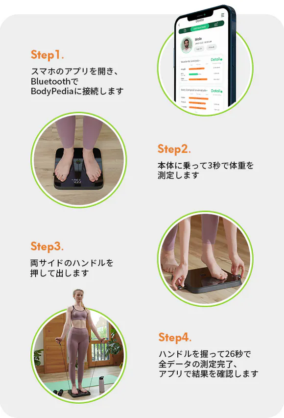 Bodypediaの使い方はとても簡単です。アプリに接続して、本体に乗り、ハンドルを握れば、わずか26秒で全てのデータの測定が完了。測定結果はアプリで分かりやすく表示します。