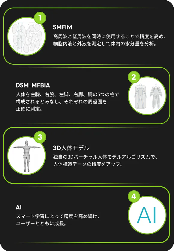 BodyPediaはDSM-MFBIA、SMFIM、3D人体モデル、AIの4つのテクノロジーをコンパクトなボディに収めています。これらの先進技術によって、わずかな変化も見逃さない卓越した精度の測定とデータ分析を可能にしました。