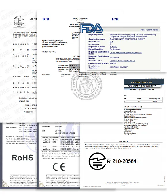 BodyPediaはJIS、TELEC、FDA、CE、FCC、RoHSなど、各国・地域における販売に必要な認証を取得しています。