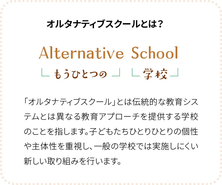 「オルタナティブスクール」とは伝統的な教育システムとは異なる教育アプローチを提供する学校のことを指します。子どもたちひとりひとりの個性や主体性を重視し、一般の学校では実施しにくい新しい取り組みを行います。