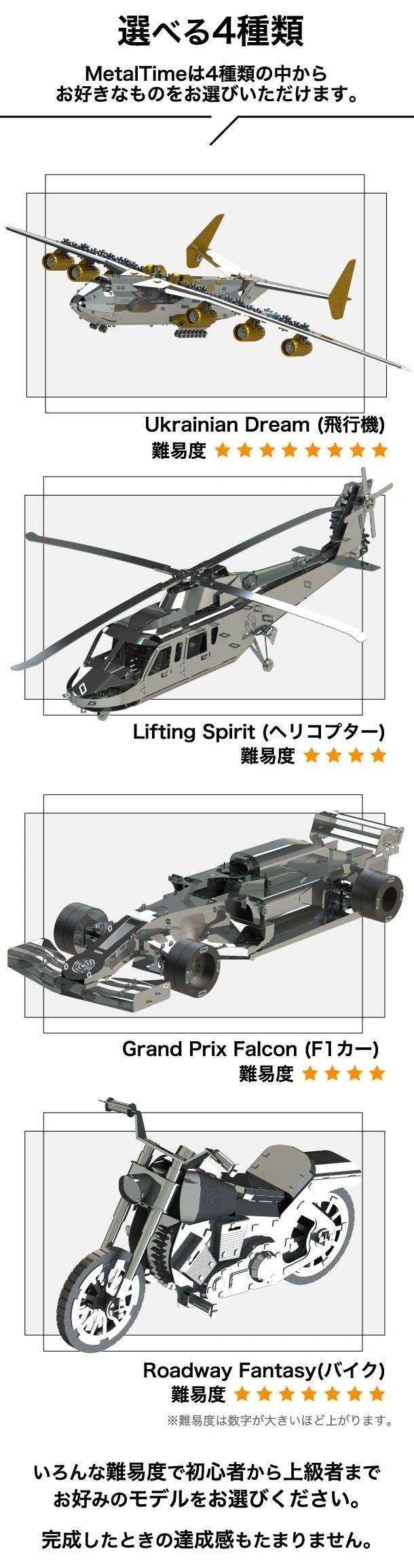 14歳以上のお子さんから、女性でも男性でも。難易度に合わせて、メタルモデルの初心者から上級者まで。一人でも、家族や仲間と一緒でも。いろんな楽しみ方ができます。