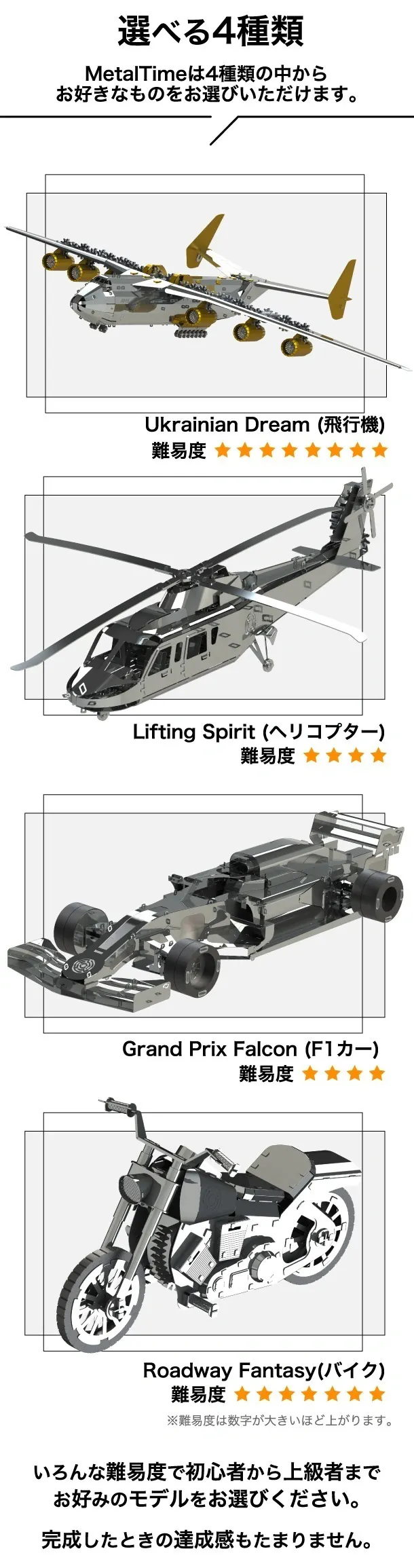 Metal Timeは素晴らしい商品です。私も実際に模型を組み立ててみて、その精巧な作り、美しさ、品質の高さに驚きました。組み立ては楽しく、時間を忘れるほど夢中になれました。