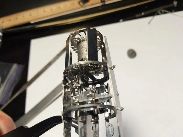 台座を兼ねたゼンマイが動力として飛行機全体の歯車を動かします。
