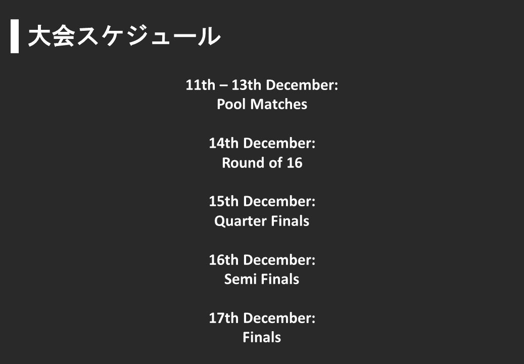 大会のスケジュールですが、12月11日に開幕し、13日まではグループに分かれてのリーグ戦が行われ、14日からは上位トーナメント、下位トーナメントに分かれて順位決定戦を行っていきます。決勝戦は大会7日目の12月17日です。