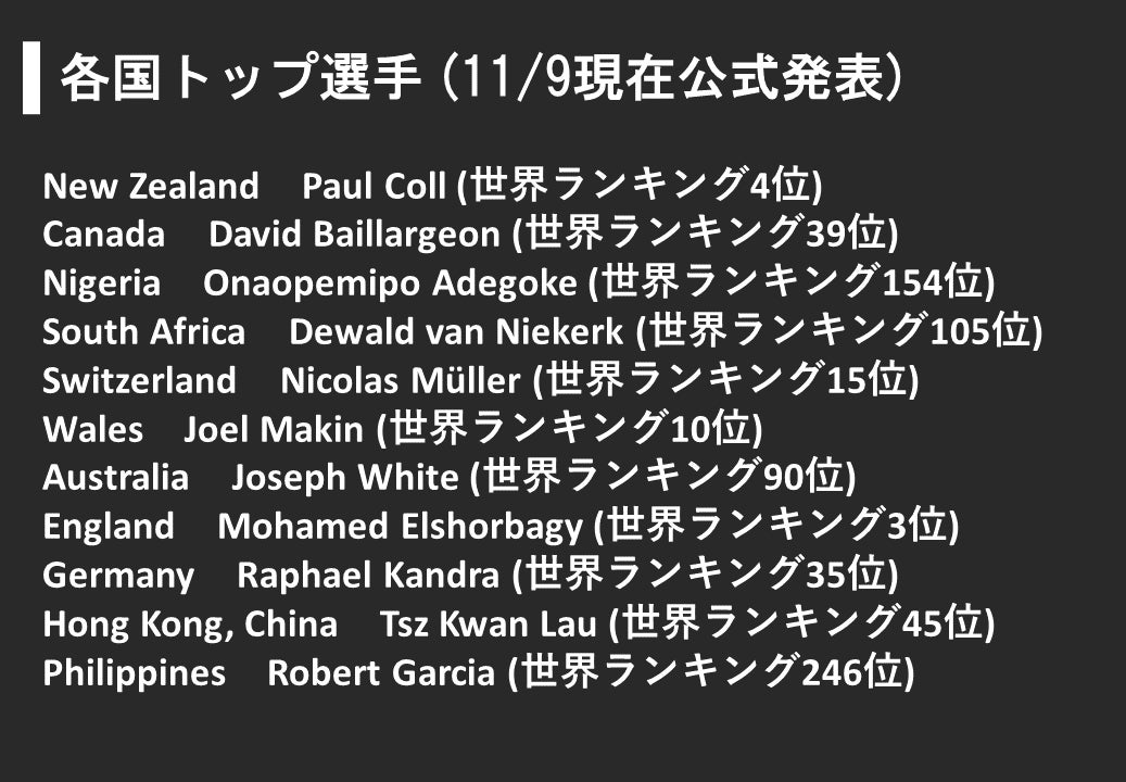 11/9現在、公式発表では11カ国の参加選手が発表され、各国世界ランキング上位から順当に選出されている印象があります。この中での注目選手といえば、世界ランキング3位の Mohamed Elshorbagy選手や世界ランキング4位のPaul Coll選手といった世界のトップを経験している選手が挙げられます。また、エジプトやフランスといったスカッシュ強豪国の出場選手はまだ未発表なため、今後も出場選手には注目していきたいところです。