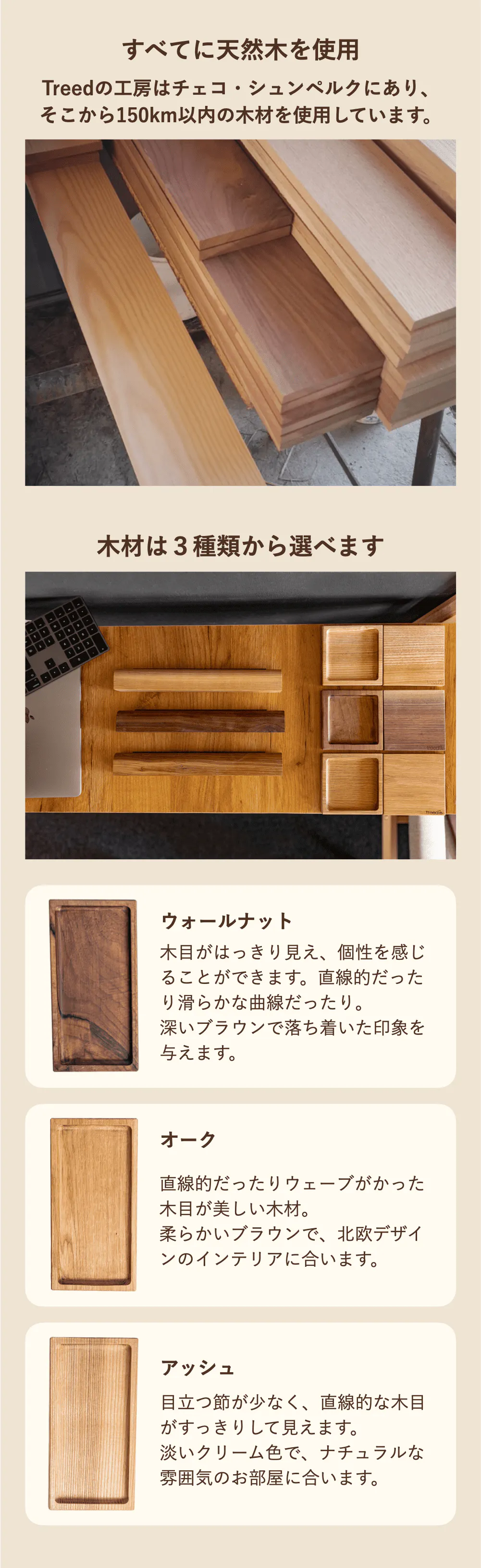 素材: 木材 (ウォールナット、オーク、アッシュ)、再生繊維板、亜麻仁油、蜜蝋
