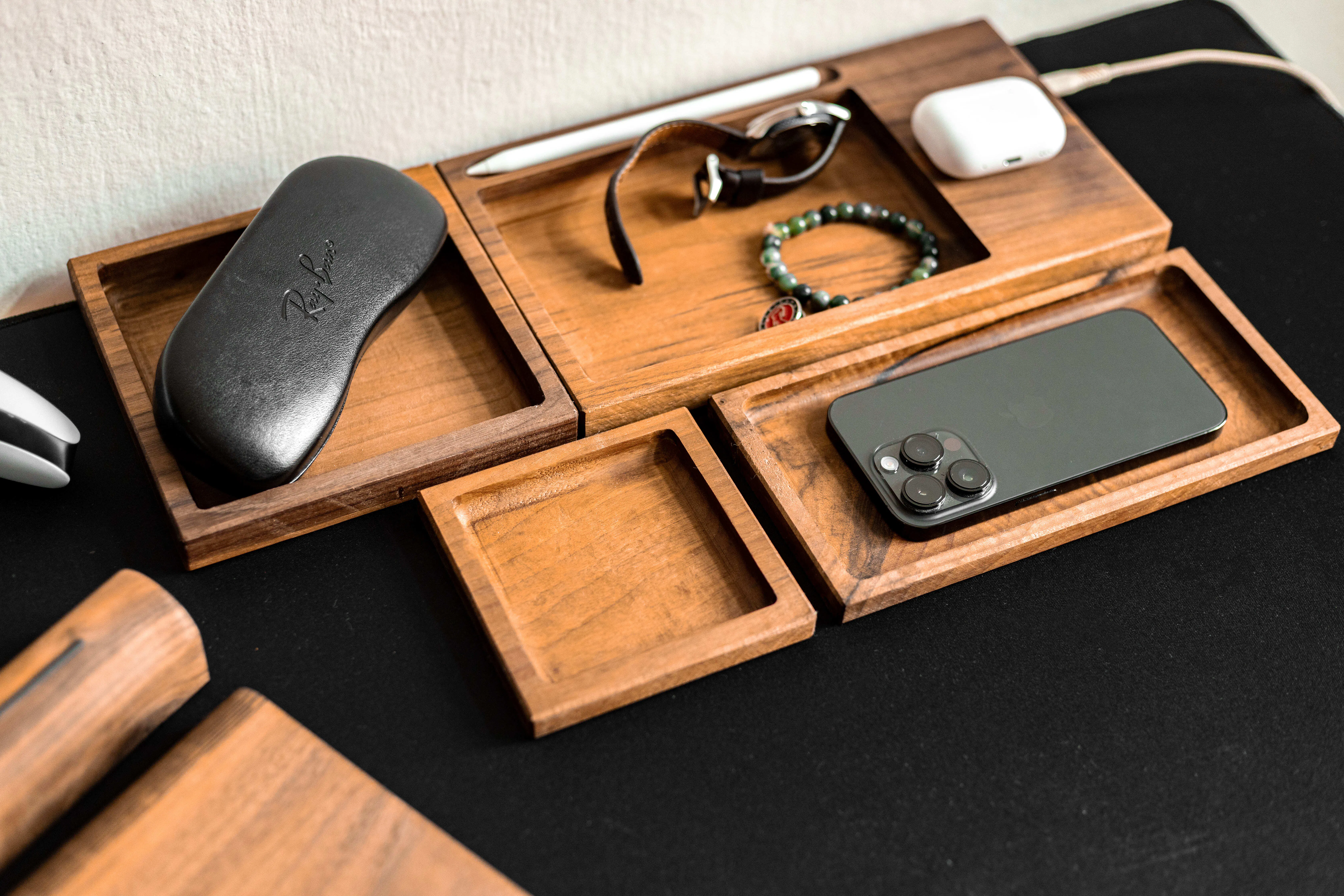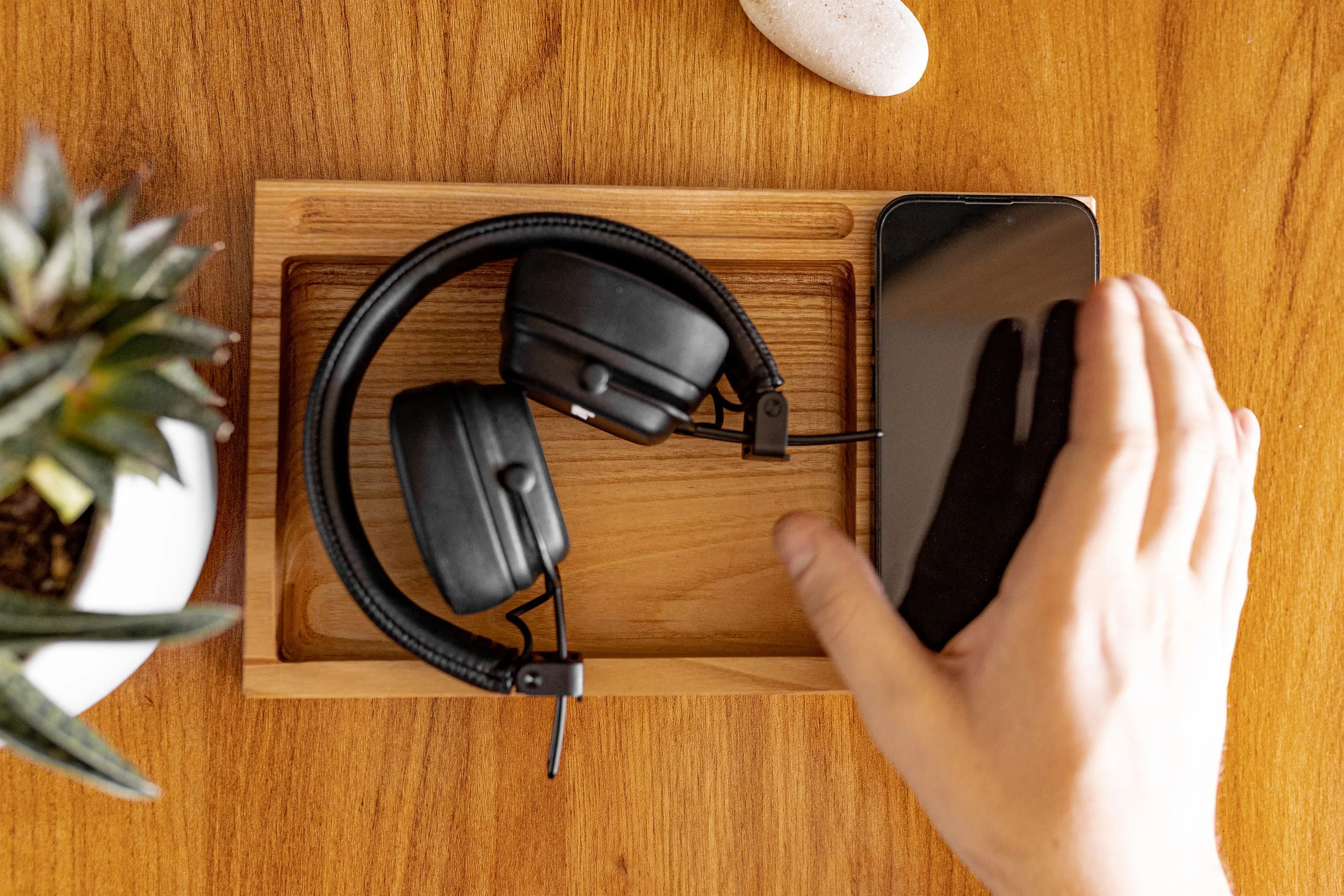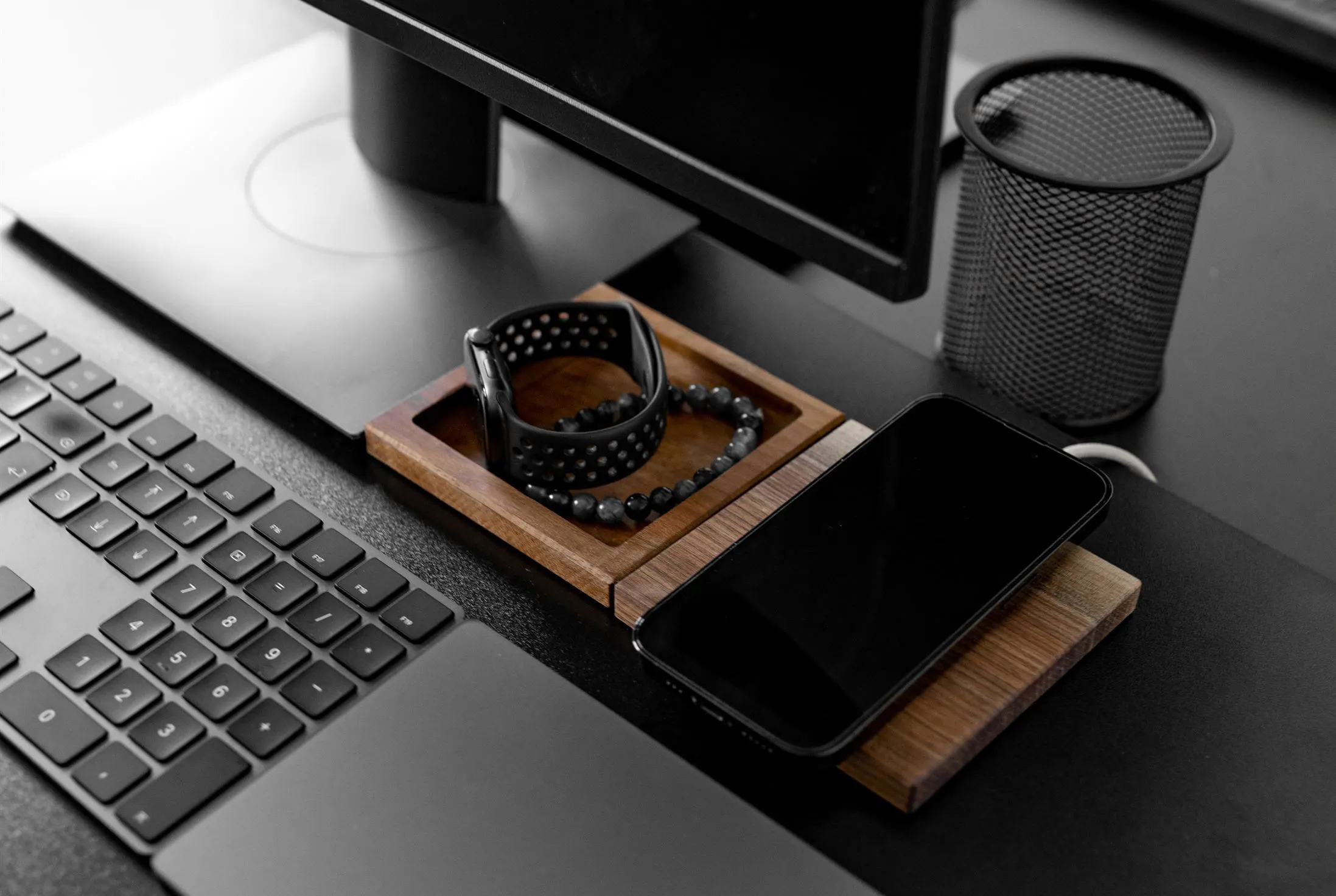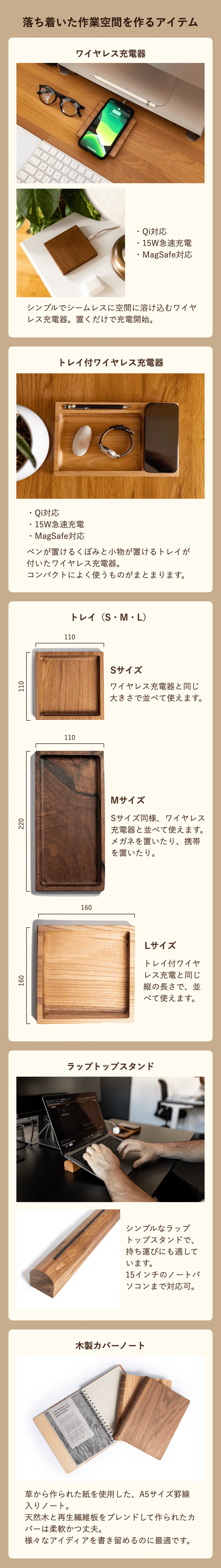 素材: 木材 (ウォールナット、オーク、アッシュ)、亜麻仁油、蜜蝋、MagSafe 対応充電コイル