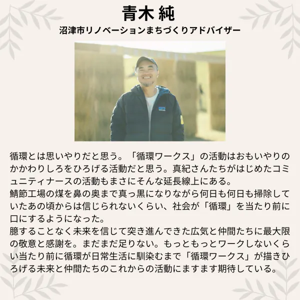 最年少スタッフながら、丁寧で細やかな仕事ぶりで「循環ワークス」の日々の運営を支えてくれる、縁の下の力持ち。看護師さんでもあり「循環ワークス」が新たに始めた活動、地域のコミュニティナースとしても活躍してくれています。
