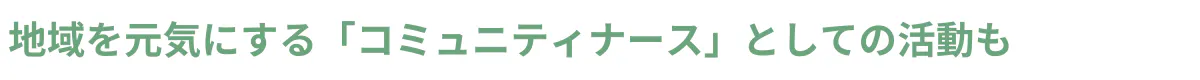 「思いやりの循環」の一環として、住宅地の真ん中でヒトとコトをつなぎ、まちを元気にするコミュニティナースの活動もはじめました。地域の人の暮らしの身近な存在として『毎日の嬉しいや楽しい』を一緒につくり、『心と身体の健康と安心』の場を提供しています。