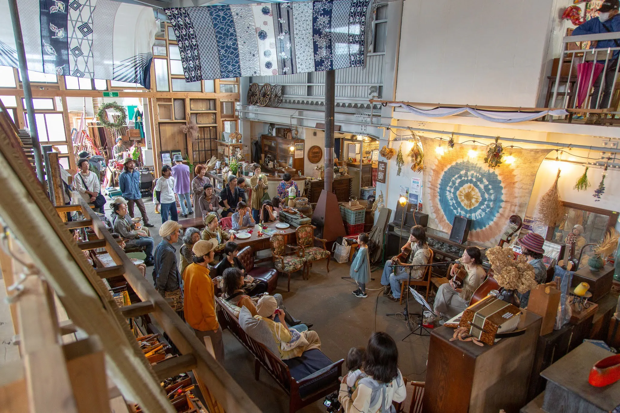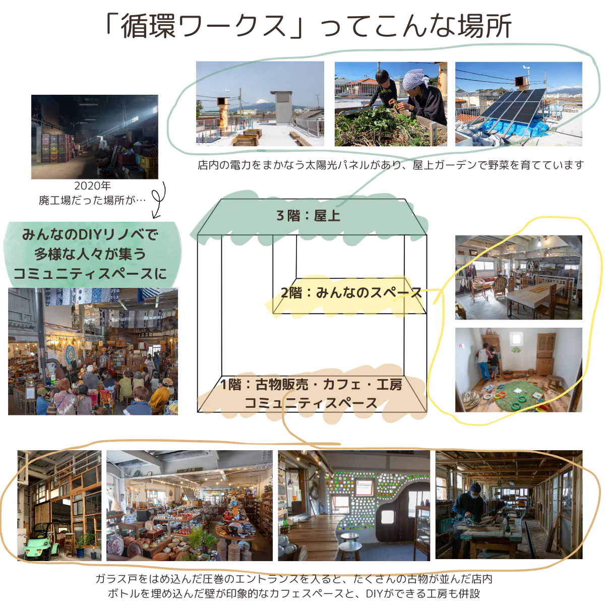 環境に寄り添い「ヒト」「モノ」「コト」を循環させて、よりよい生活のしくみを考える「循環工場」としてコミュニティスペースを運営しています。「循環ワークス」の普段の活動は、不要な古物の回収と販売、オーガニックカフェ、ワークショップなどを行っています。