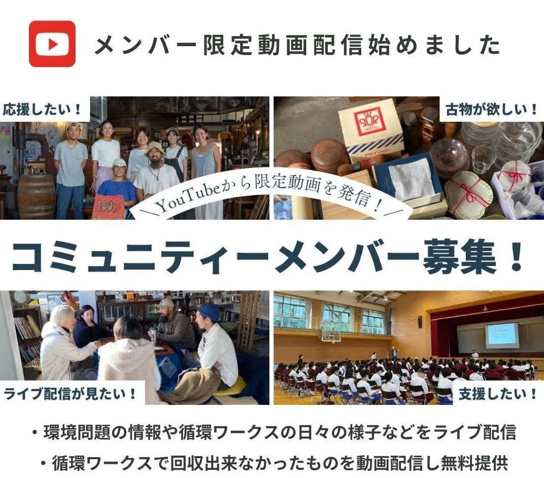 「循環ワークス」ではYouTubeのコミュニティメンバーも募集しています。メンバー限定動画を見られたり、循環ワークスでは回収しきれなかったものをメンバー限定で動画配信し、無料譲渡を行っています。