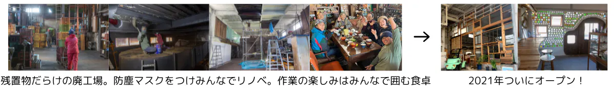 「循環ワークス」の工場は、元々サバ節工場として使われたのち、長く放置されたボロボロの廃工場でしたが、のべ500人以上のサポーターと一緒に、DIYでリノベーションして作りました。同じ時間を過ごし、体験を共有することを大事にしています。
