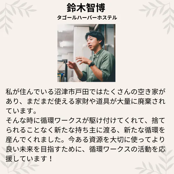 「もったいない」と「使い捨て」にあふれた、一方通行の矢印をぐるっと回し「循環」させたい。自然や、様々な人と共存できる、持続可能な生活を目指すために、だれもが「できることがある」という認識を広めたい。そんな気持ちで「循環ワークス」では、環境に寄り添いながら「ヒト、モノ、コト」が循環する世界を実現するためのコミュニティスペースを運営しています。「循環ワークス」公式HP
