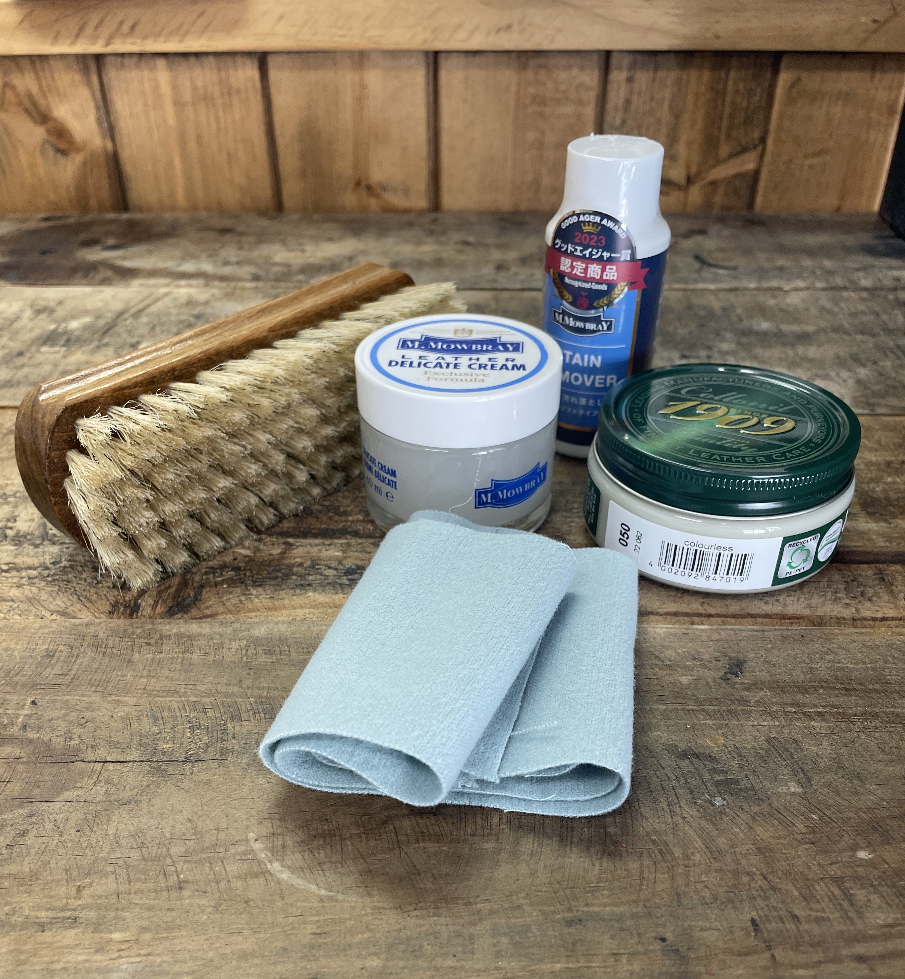 遠方の方には当店オススメの靴磨きセットをご用意しました。このセットは、靴だけでなくバッグやジャケット、革小物にも利用できるようにオールマイティなグッズとその使用方法をご用意しましたので、安心してお使いいただけると思います。