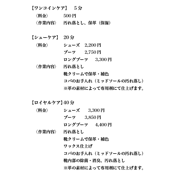 靴をピカピカにするのが靴磨きではありません。靴のコンディションを整えるのが靴磨きです。身だしなみの一つです。理容室や美容室に行くのと同じです。服を洗うのと同じです。そこに良い靴も悪い靴もありません。お気に入りの靴だからと言って、同じ靴ばかり履いてしまうことってありませんか?お手入れをしないで同じ靴ばかり履いてしまうと汚れたり傷みやすくなってしまいます。