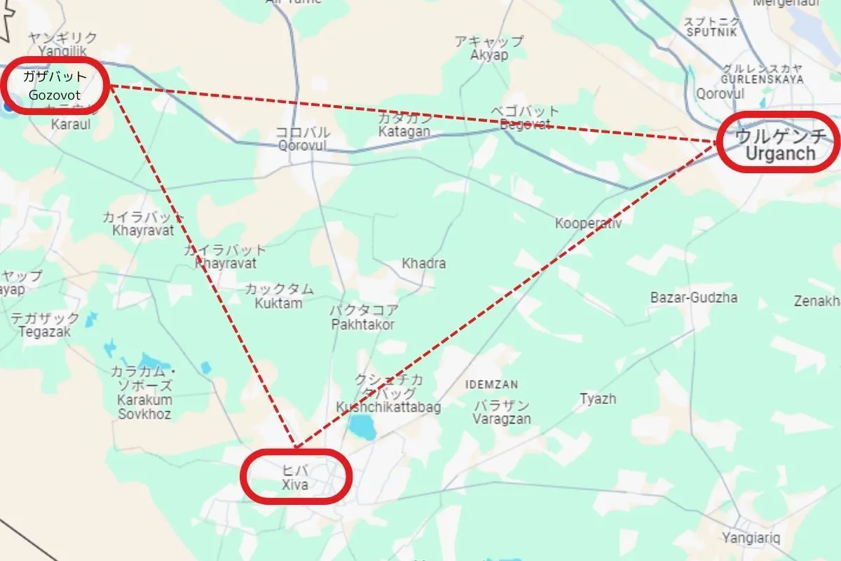ホラズム州の都市ウルゲンチ、世界遺産があるヒヴァと私が住んでいる村(ガザバット)は上の図のような位置づけになります。