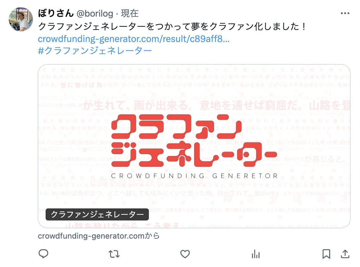 当プロジェクトはこのクラファンジェネレーターを1人でも多くの人に認知していただくこと。