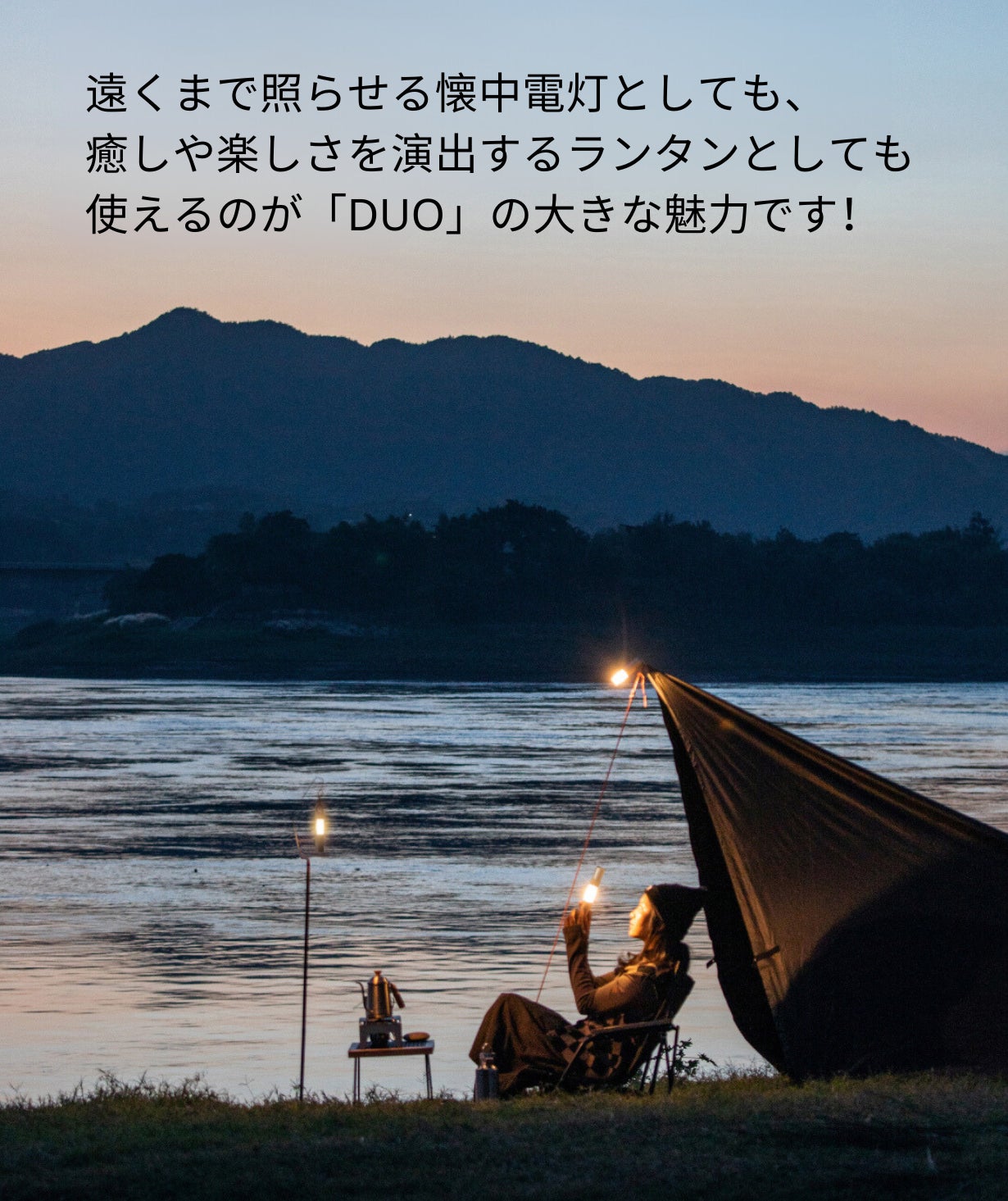 「DUO」はその多彩な機能と工夫が、キャンプやアウトドアのシーンに新たな光をもたらし、使い勝手と楽しさを向上させています。使う人々の声に耳を傾けながら光の可能性を広げるために生まれた一本です。