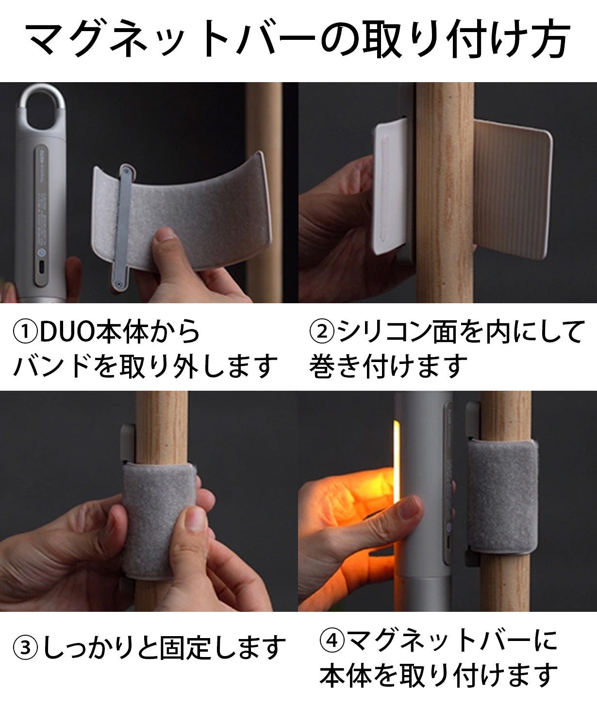 さらに、「両手を空けて作業を行いたい」「懐中電灯を引っ掛けて使いたい」「ランタンを金属面に貼りたい」といった声にも応えるために、ループ型フックとマグネットベースを搭載し、非金属面でも使用可能なバンドとマグネットバーのセット(デュオ)も開発されました。