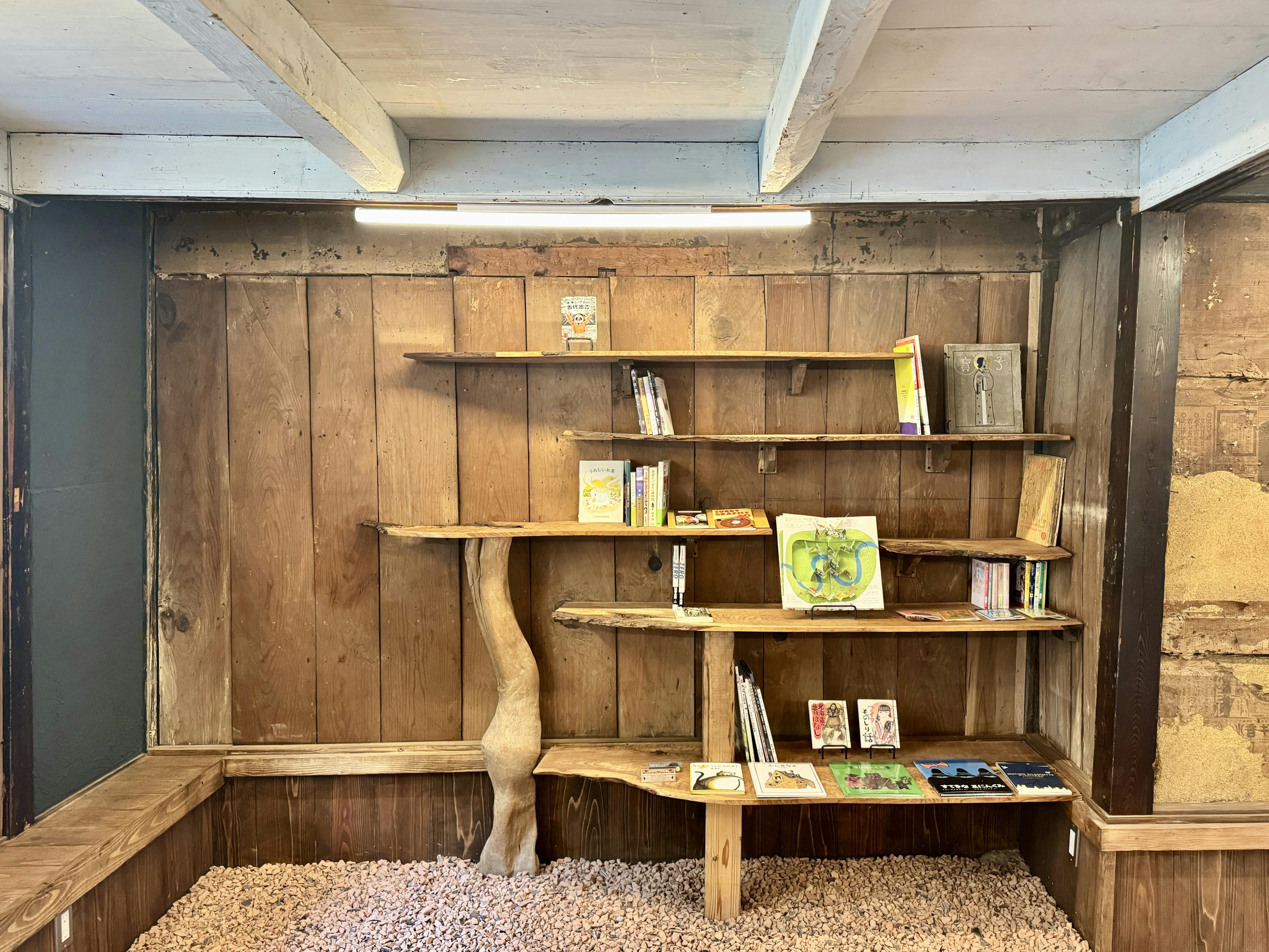 こちらは違う角度から。筋交いのところにこちらも無垢のL字けやき材を据え置き、丸太で支えています。ここは新刊を置いたり、選書家の本を陳列するコーナーにする予定です。