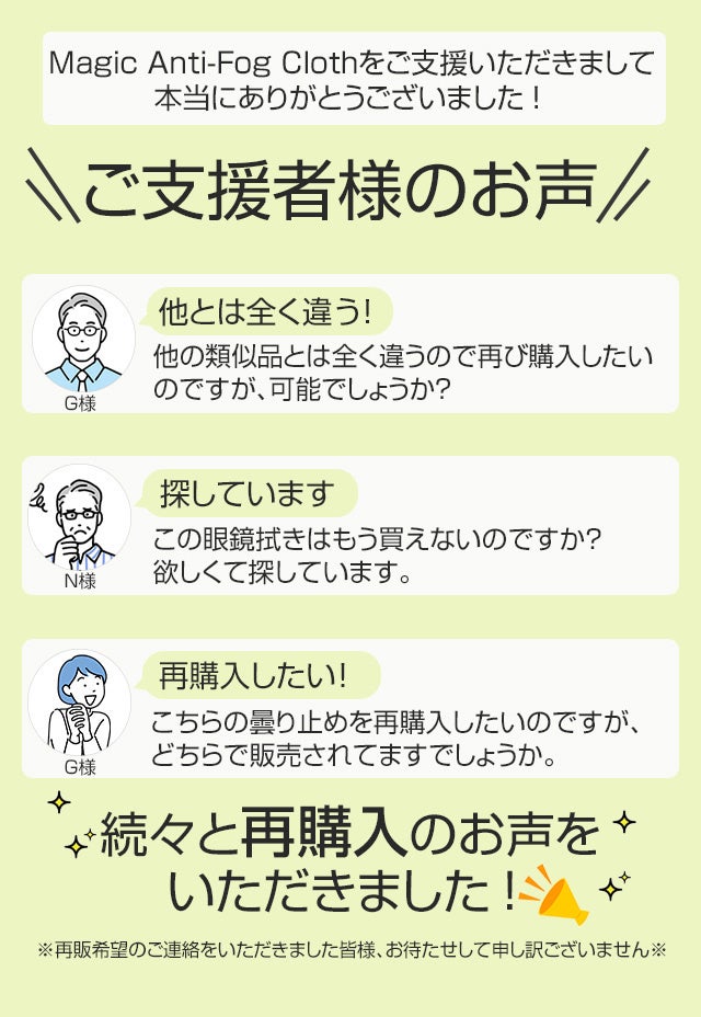 特別価格にてご提供させていただいておりますため、前回ご支援いただけましたサポーター様も、曇りにお悩みの方は是非ご覧いただきたいと思います。