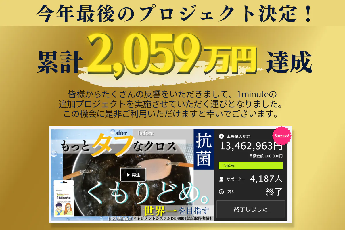 高密度マイクロファイバー素材の曇り止めクロスとしてご紹介し、たくさんのご支援者様より反響をいただきました。