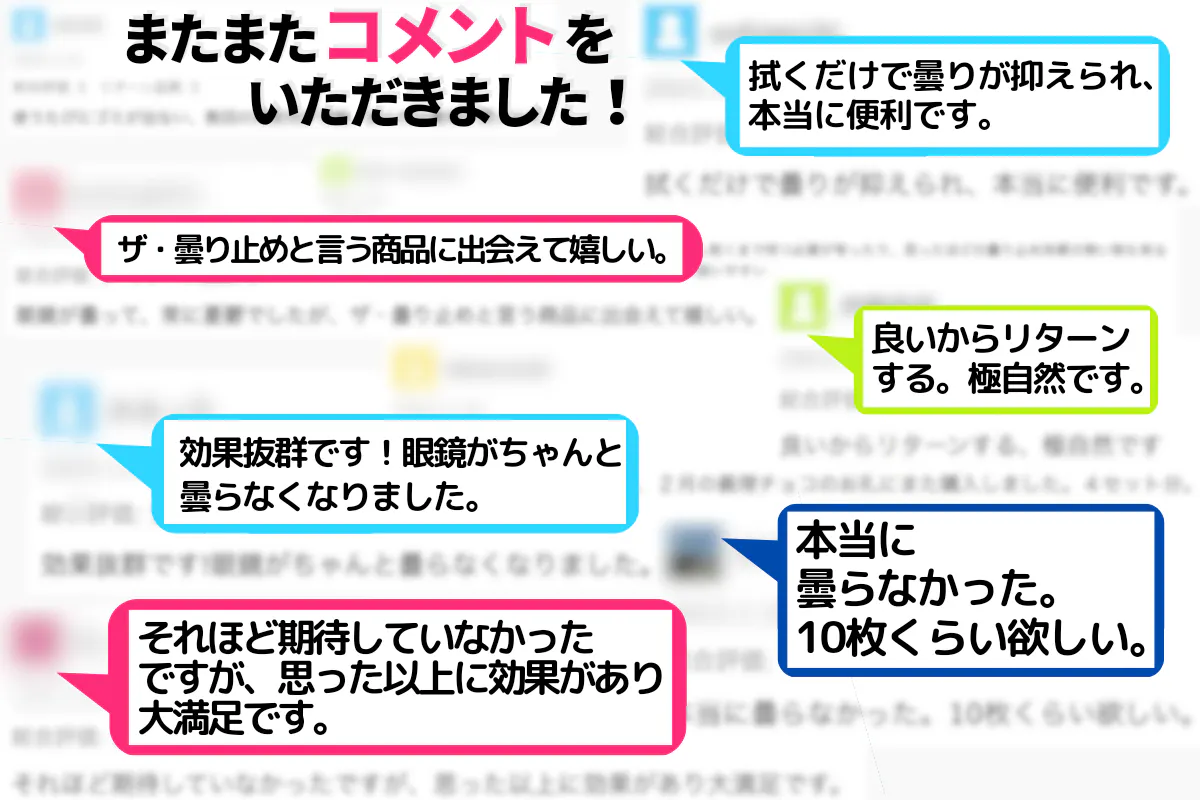 本商品で拭いても効果が見受けられない場合は、中性洗剤を1滴つけて水で洗って頂き、乾いた布でレンズを拭いていただいて水気のない状態で本商品をご使用されると効果が発揮されます。