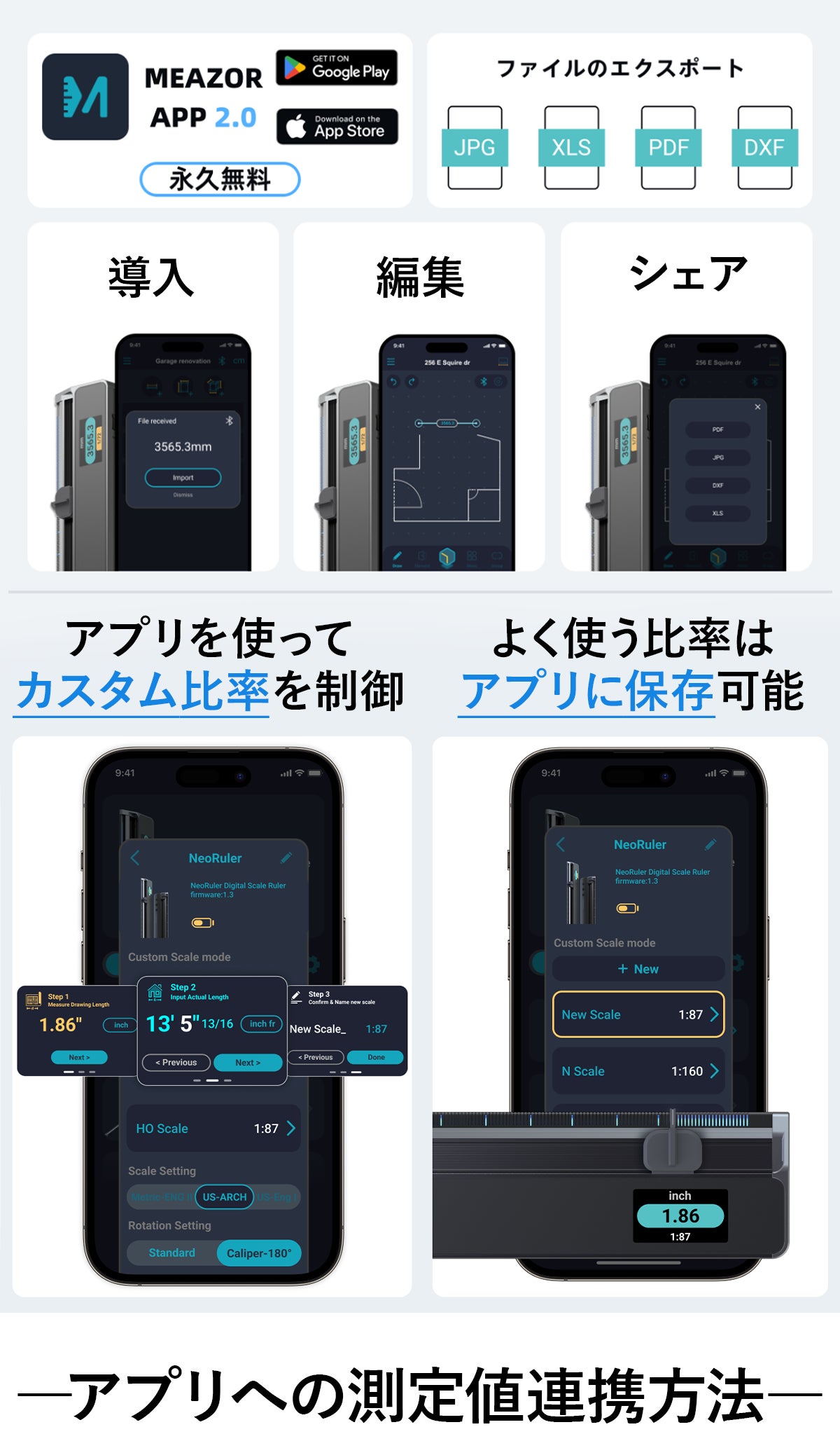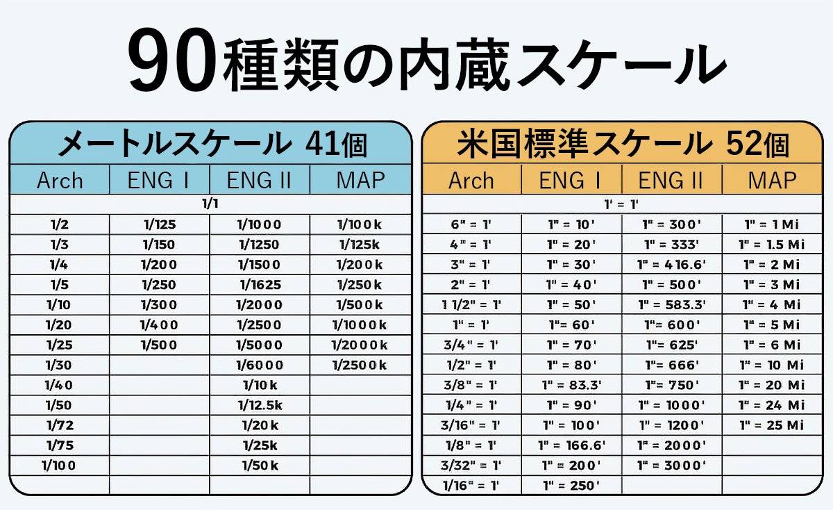 内蔵スケールを選択するだけで簡単に倍率計算でき、更にカスタマイズでスケールを作成することも可能!