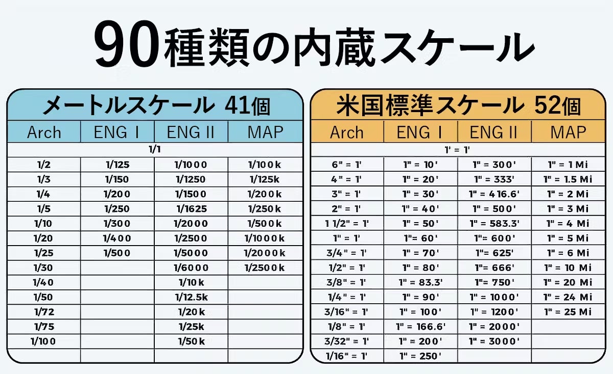 NeoRulerには、内蔵スケールが90種類も含まれており、簡単に倍率計算が行えます。さらに、ユーザーはスケールをカスタマイズして作成することも可能です。図面制作時に発生する複雑な計算作業を簡略化し、自動で計算を行うことができます。