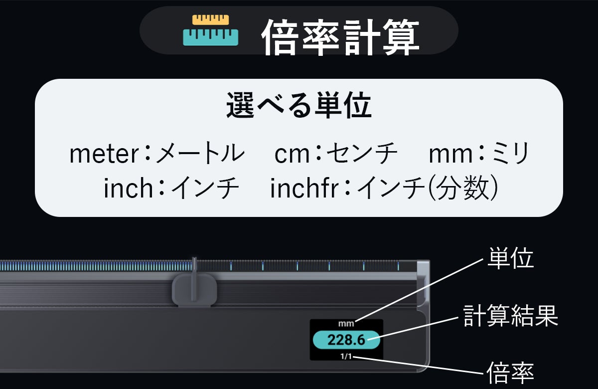 NeoRulerは、倍率計算モードを選択することで、簡単に倍率の設定と単位の設定が可能です。設計者やエンジニアは、必要な倍率と単位を選ぶことで、正確な測定が可能となります。煩雑な計算作業から解放され、効率的に作業が進められます。