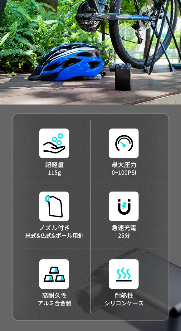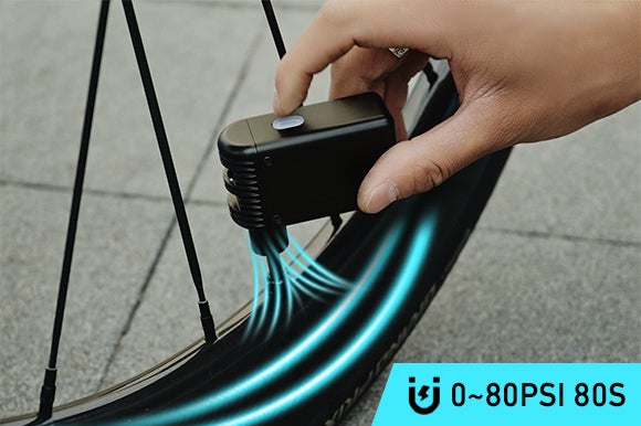 また、ワンタッチで自動空気充填ができ、ロードバイク用タイヤを0 PSIから80 PSIまでわずか80秒でスピーディーに空気を入れることができます。モバイルバッテリーから給電ができ、25分でフル充電が可能なため、再利用性と携帯性が大幅に向上します。