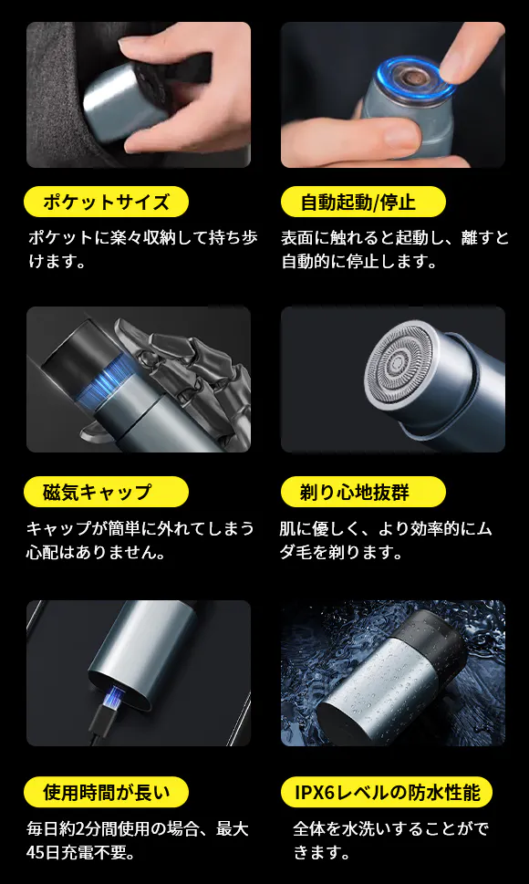 キャップは磁気設計により、本体先端に自動的に吸着され、持ち運びや保管にも便利でカッターヘッドを清潔で衛生的に保ちます。多くのシェーバーとは異なり、キャップが簡単に紛失したり、鞄の中で移動中に落ちたりする心配はありません。