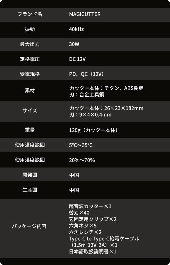 ・使用中に刃が熱くなるため、プラスチックを切断する際に溶ける可能性があります。