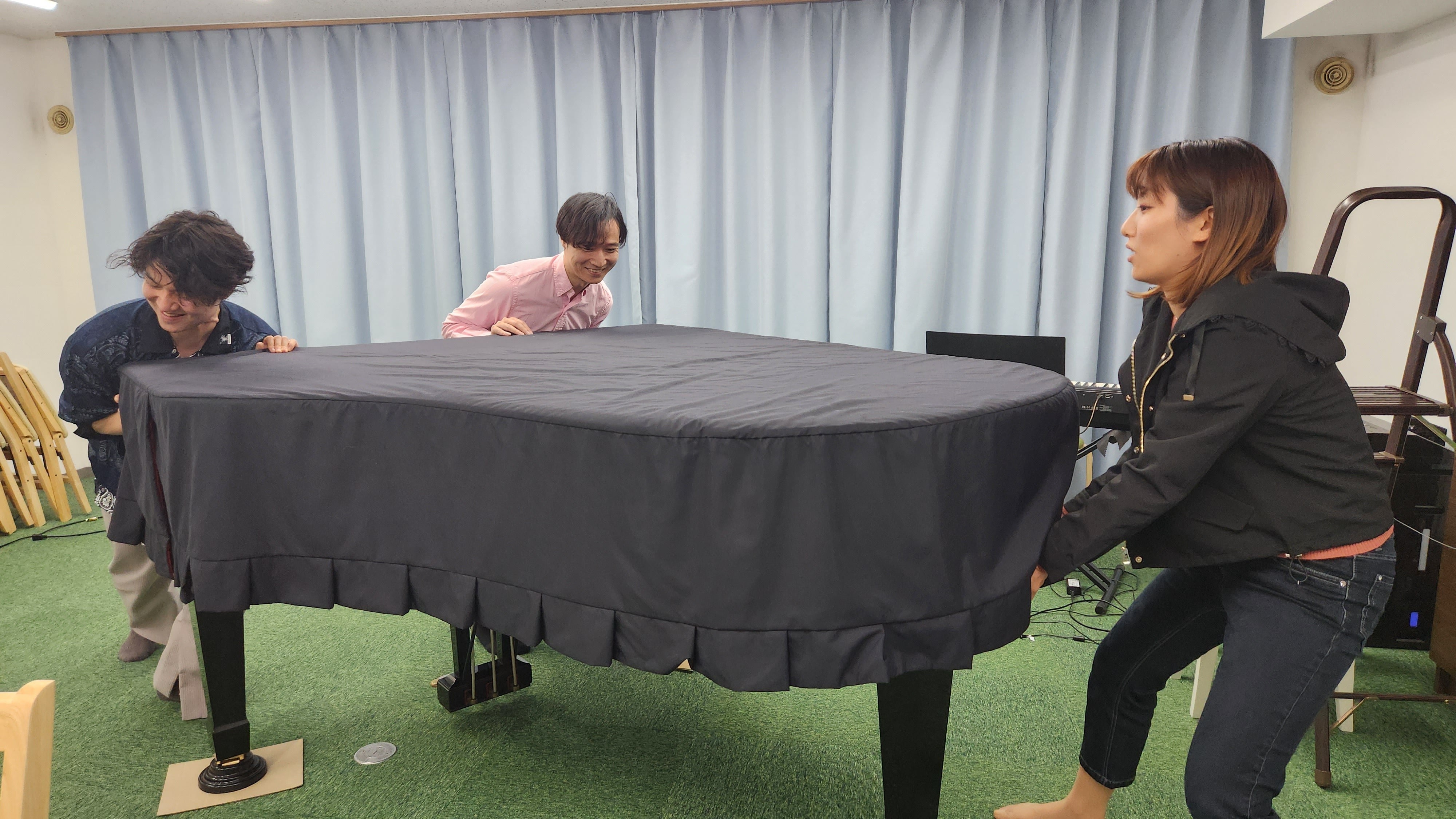 普段は音楽サロンとして親しまれている会場も、公演に向けて準備が進んでいます。キャストとスタッフが力を合わせ、グランドピアノを移動させ、本番での演出を念頭に置いたステージの位置を決定しました。
