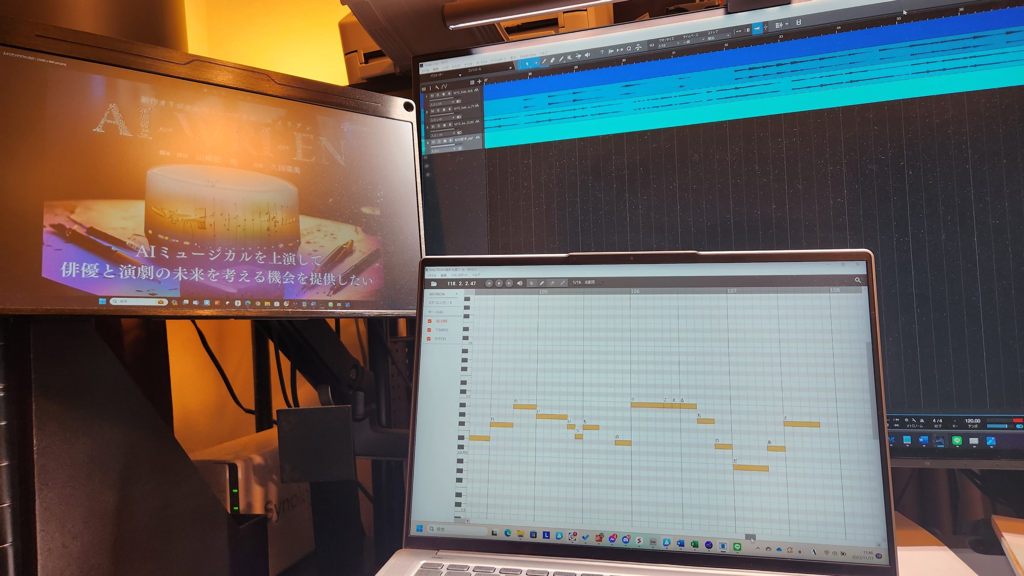 「AI-WRI-EN」は、冨田勲氏の「イーハトーヴ交響曲」に大きな影響を受けた作品です。脚本・演出を担当する山崎自身がその初演と再演演奏会に出演し、初音ミクとオーケストラが共演する歴史的なステージに立った経験から、電子音楽と人間が演奏する生音楽の融合という新たな境地を開拓した冨田氏の精神を、このミュージカルに織り込みました。機械が生み出す独特のサウンドと人間の奏でる温かみのある音楽が融合することで、私たちは新しい音楽表現の可能性を探求しています。