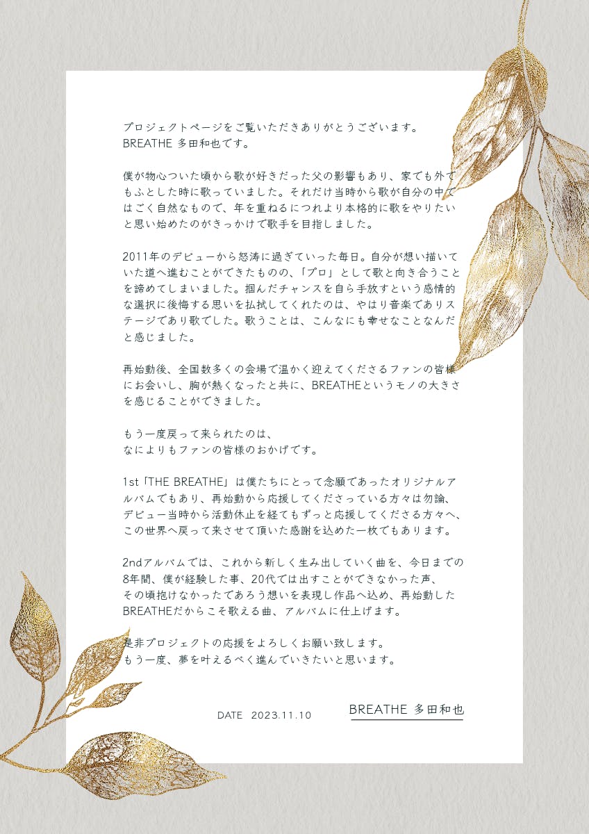 そして、これまで愚直に歩んできた成果としても、年を重ねてたくさんの大切な出会いが増えることでも、より違った歌との向き合い方ができるようになったと思います。そんなBREATHEだからこそできる歌との向き合い方をファンの皆様と共有したいとの願いから、2ndアルバムをクラウドファンディングで制作することにしました。