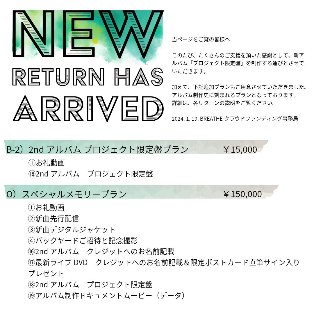 2024/06/21 14:41この度は沢山のご支援誠にありがとうございました。「Lovers' Voices Ⅱ」はBREATHEにとって2枚目のオリジナルアルバムということで、再会、新たな出会い、経験、表現、チャレンジと、、様々なエッセンスを詰め込んだ作品となりました。今回の為に書き下ろされた楽曲中心で、ライブでもバンドでは初披露の曲ばかりとなりますので、今月末からの全国ツアーもぜひ楽しみにしていてください!今回の初回限定生産盤が、プロジェクト盤という位置付けで制作をさせていただきました。当初ご支援者様限定での作品とすることを想定しておりましたが、プレスをするにあたり100枚強の少数ロッドで制作をするよりも、多くの枚数にすることで制作費を大幅に削減できることとなり、このような選択をさせていただきました。それにより、皆様からのご支援金を収録曲の制作数、リリックビデオの曲数を増やすことができました。心より感謝申し上げます。多くプレスした限定枚数を今回は販売させていただく運びになり、在庫はこの度全て必要としてくださっている皆様へ販売させていただきました。後のお知らせとなってしまったこと大変申し訳ございせんでした。ツアーからは通常盤の販売とさせていただき、プロジェクト盤(初回限定盤)の販売は致しませんが、ここから沢山の皆様の心へこの作品が届くことを願ってチーム一丸でツアーを頑張って参りたいと思います。全国ツアーにおけるリターン「バックヤード招待&記念撮影」「ミニライブご招待」につきまして、対象者様にメッセージを送らせていただきましたのでご確認いただけましたら幸いです。この度は多大なるご支援と応援をありがとうございました。BREATHEクラウドファンディング事務局 もっと見るいよいよアルバムリリース間近!!