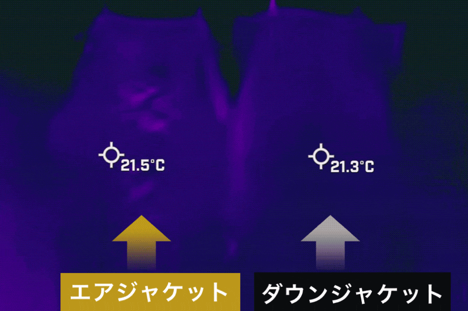 下記は、同じ環境下でエアロゲルジャケットとダウンジャケットを配置し、温度の上昇具合を比較しました。エアロゲルジャケットの方が温度が速く上昇していることが確認できます。