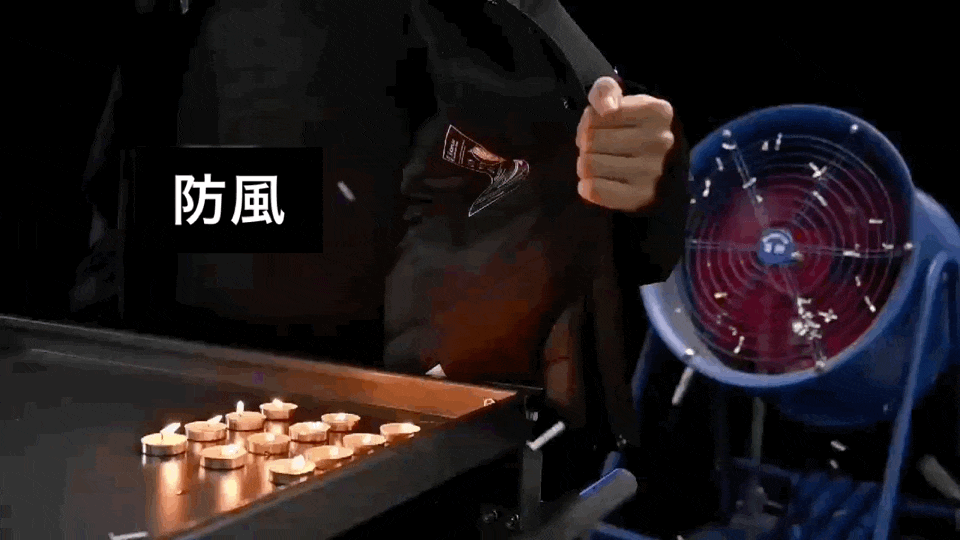 強風や吹雪のような悪天候からあなたををお守りします。下記は表面素材の防風性能の実証実験の様子です。大型扇風機で風を当てていますが、裏側(キャンドル)には全く伝わっていないことがわかります。