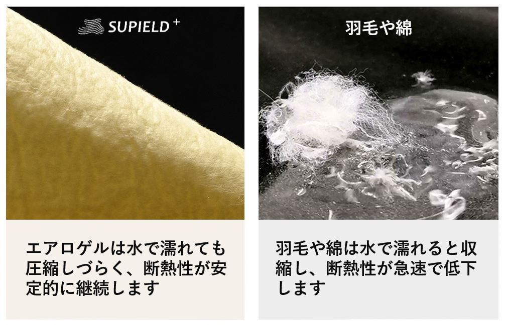 また、エアロゲルは外気の寒さを断熱しながらも、内側から湿度や空気を通すので、蒸れなく快適に着ていただけます。