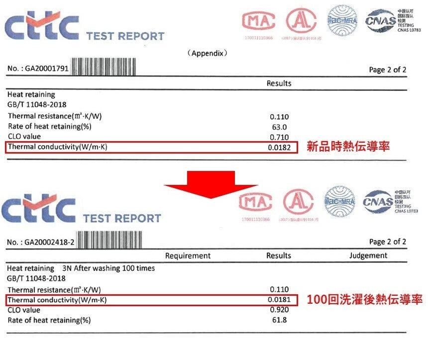 実証実験も実施し、S.KISTLERエアロゲル素材の初期熱伝導率は0.0182 W/(m・k)、100回の洗浄と乾燥を経ても熱伝導率は0.0181 W/(m・k)とほぼ変わらないことが確認されました。