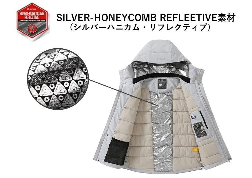 裏地にシルバーハニカム・リフレクティブ素材を採用しており、体から反射する遠赤外線熱を効果的に反射し、暖かさを保ちます。
