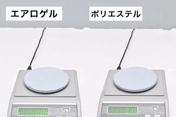エアロゲルは非常に軽い素材です。ポリエステルと比較しても一目瞭然で、長時間着用していても体への負担が少なく、快適な着心地を実現します。