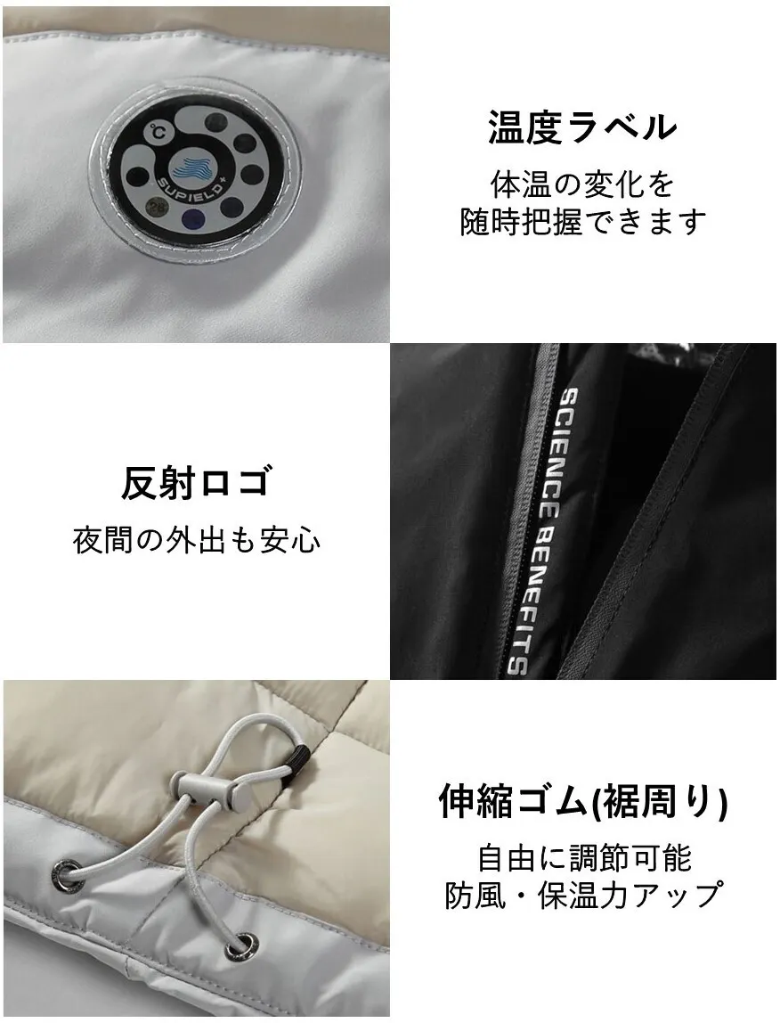 また、エアロゲルは外気の寒さを断熱しながらも、内側から湿度や空気を通すので、蒸れなく快適に着ていただけます。