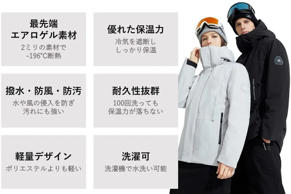 エアロゲルジャケットは、ダウンジャケットに比べて圧倒的な保温性を誇り、寒い季節のアウトドアアクティビティや日常の防寒など、様々なシーンで活躍します。