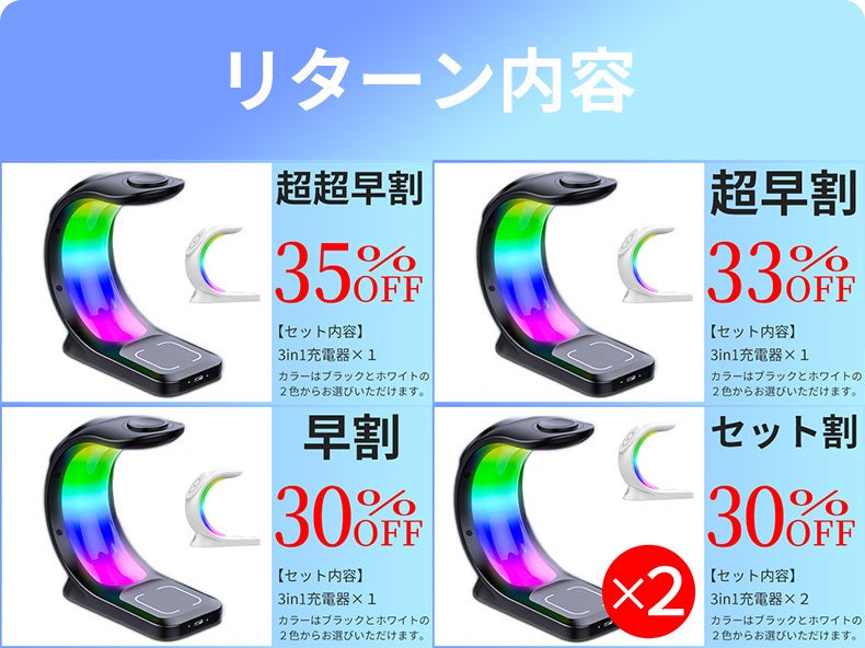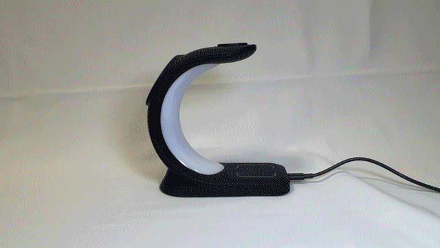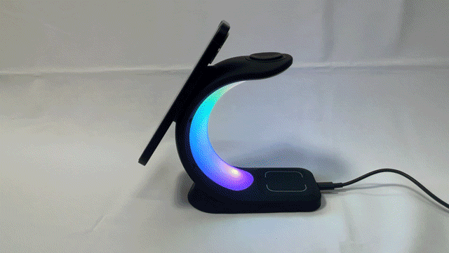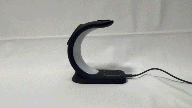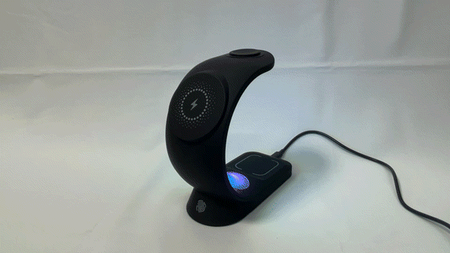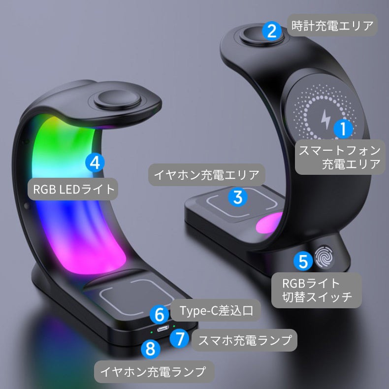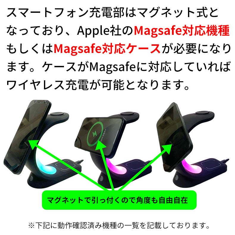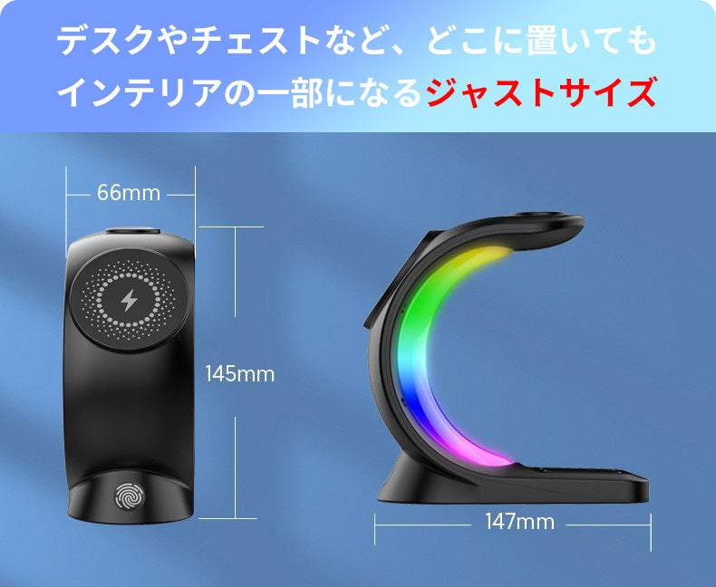 LED搭載の3in1ワイヤレス充電器。デスク回りのごちゃごちゃした配線をこれ一つでスッキリ綺麗に♪6パターンのLEDライトで、デスクだけでなくお部屋のインテリアの一部としても溶け込みます。